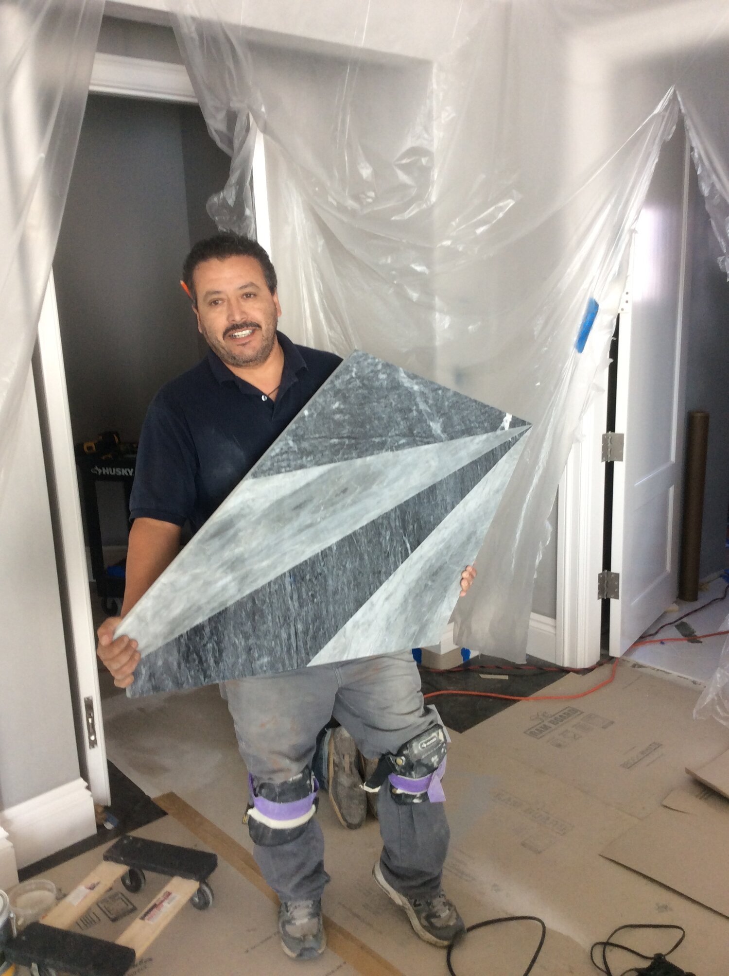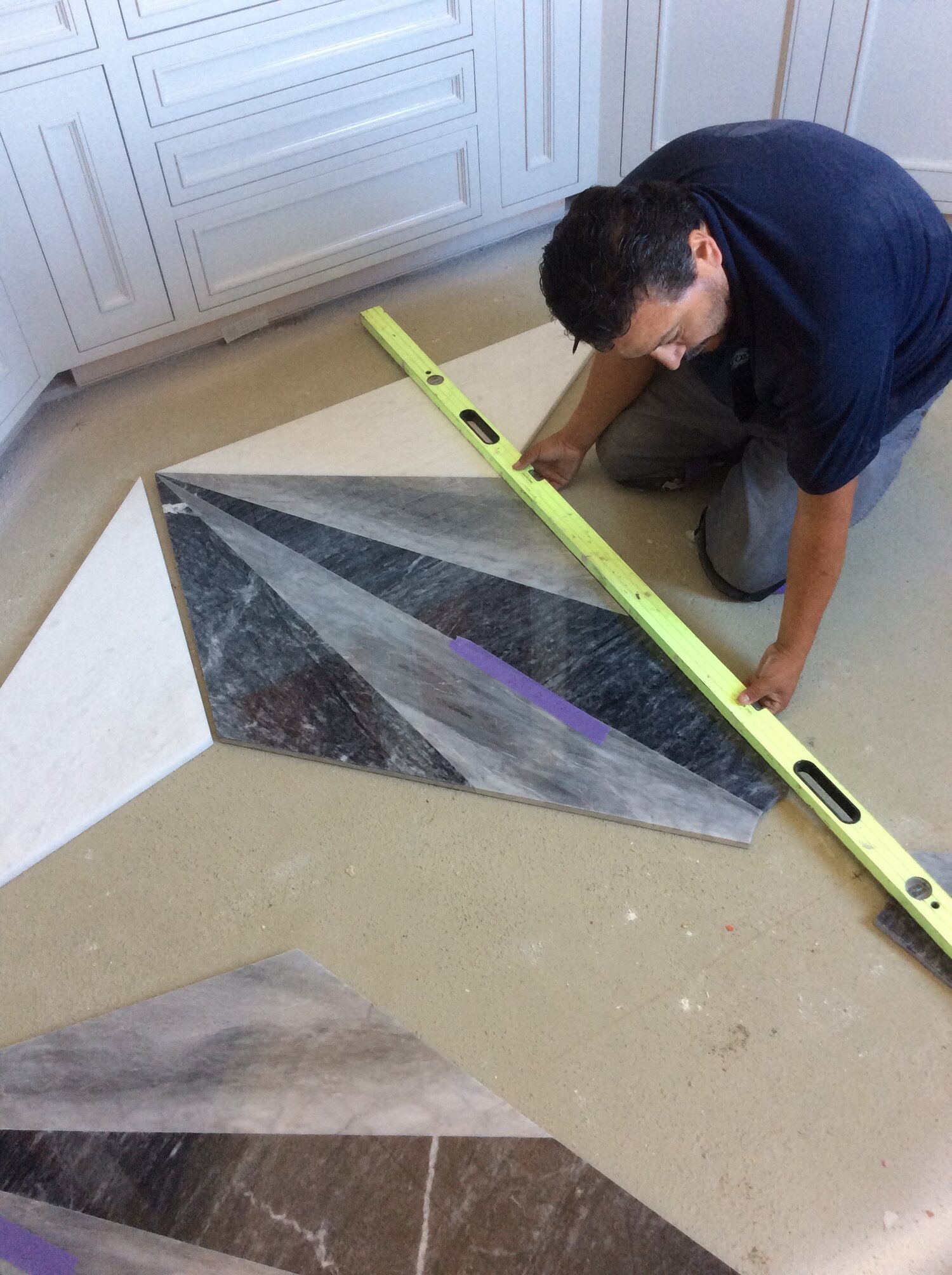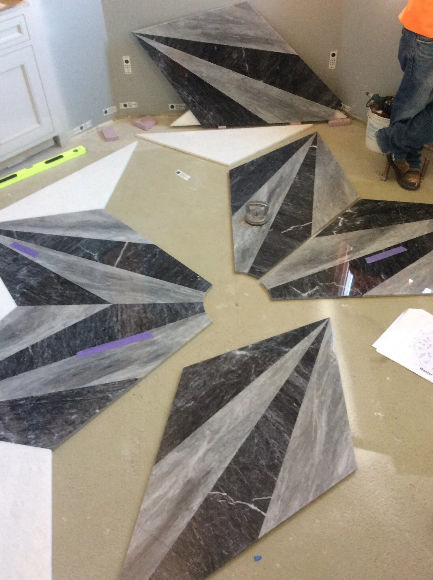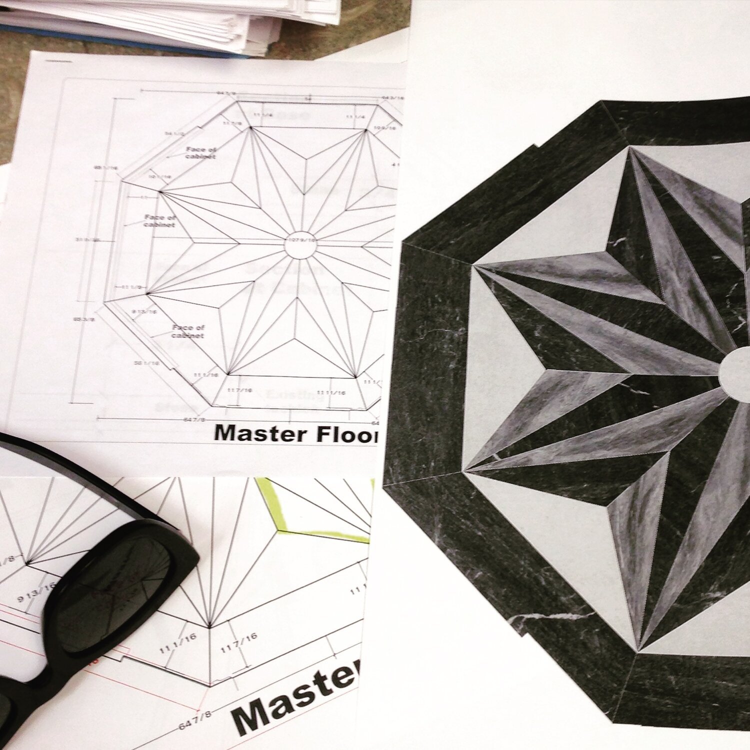 Once the pattern was conceptualized, and our ‘official drawings’ were complete, we then set to choosing the material… This pattern could read a thousand different ways based on the color selection of the material! Our pallet for the Primary Suite had morphed in to soft grays, which we wanted to carry through in the floor… yet the clients fell in love with the starburst pattern and wanted there to be an element of contrast, so that it would really read as something special and different…